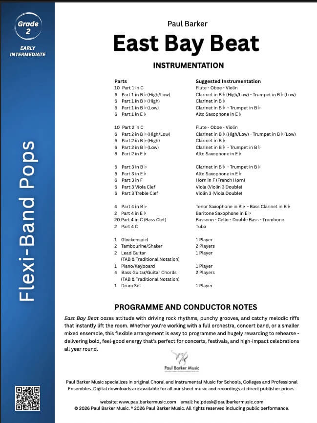 The Flexi-Band Pops Series Book 2, brings fresh energy to the early-intermediate stage with three pop originals designed for any combination of instruments. From the cool vibe of East Bay Beat to the infectious rock-fusion groove of Funk City Blues and the uplifting rock anthem Stardust, the flexible instrumentation allows orchestras, bands, and ensembles of all sizes to build an exciting and versatile modern program.